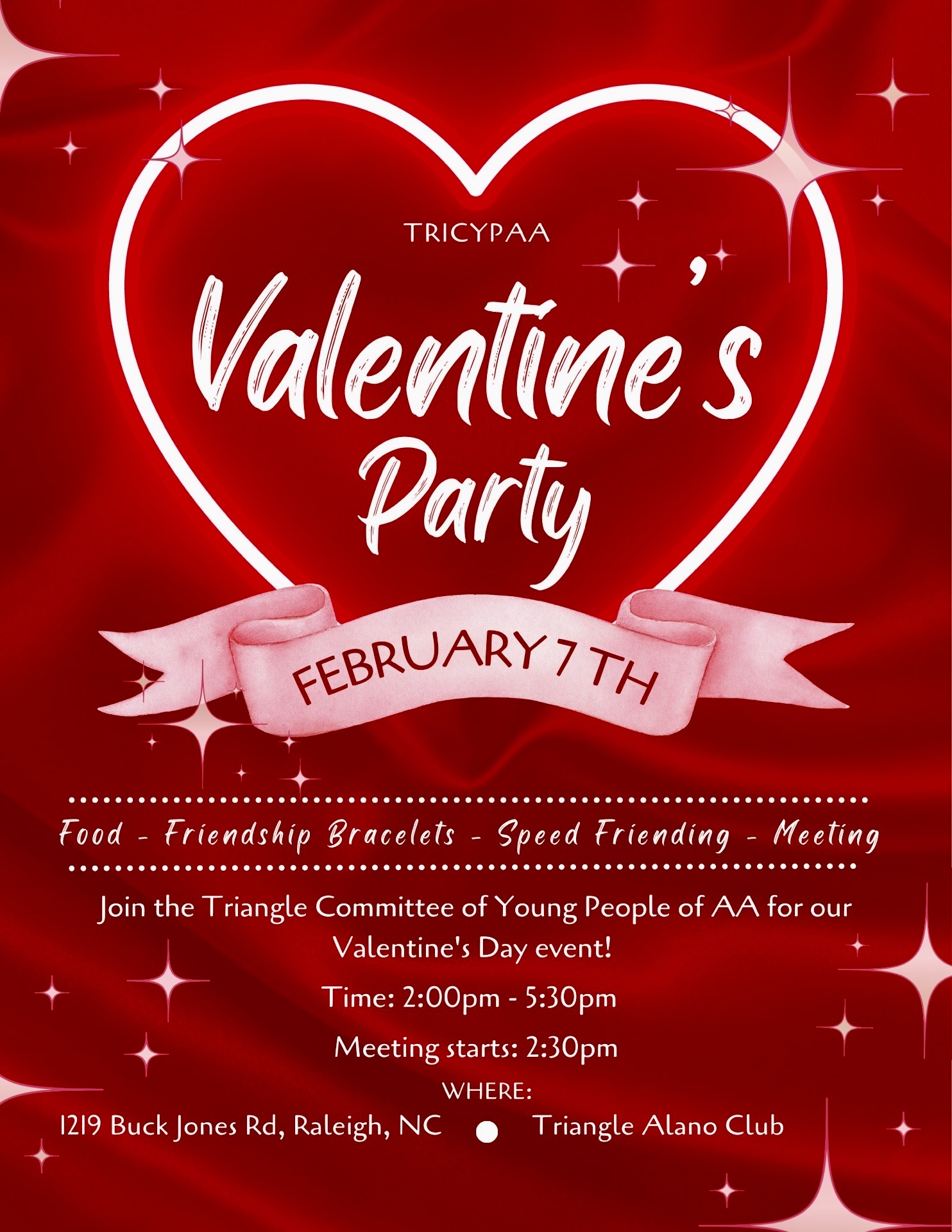 Join the Triangle Committee of Young People of AA for our Valentine's Day event featuring food, friendship bracelets, speed friending, and a meeting!