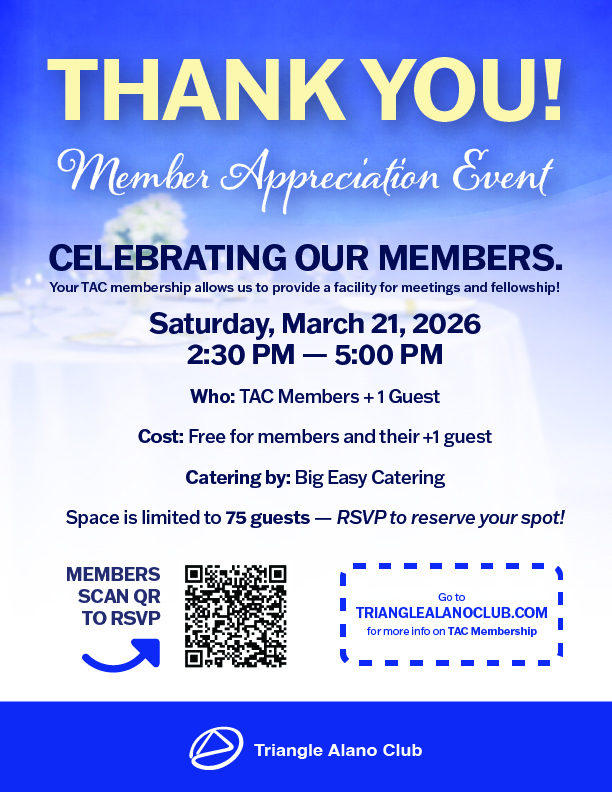 The mission of the Triangle Alano Club, Inc. (TAC) is to provide a safe, comfortable meeting place and social environment for recovering persons and their families in Alcoholics Anonymous, Al-Anon and Alateen groups.